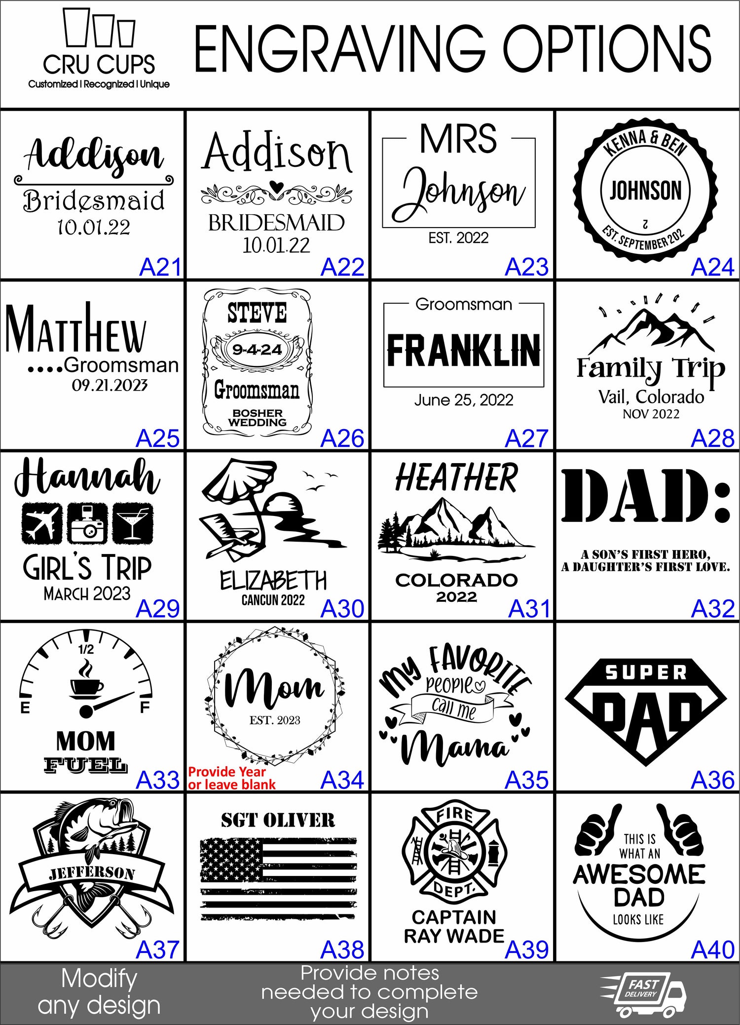- Provide your personalization (name, initials, text, date, title, year, etc. needed to complete your design)